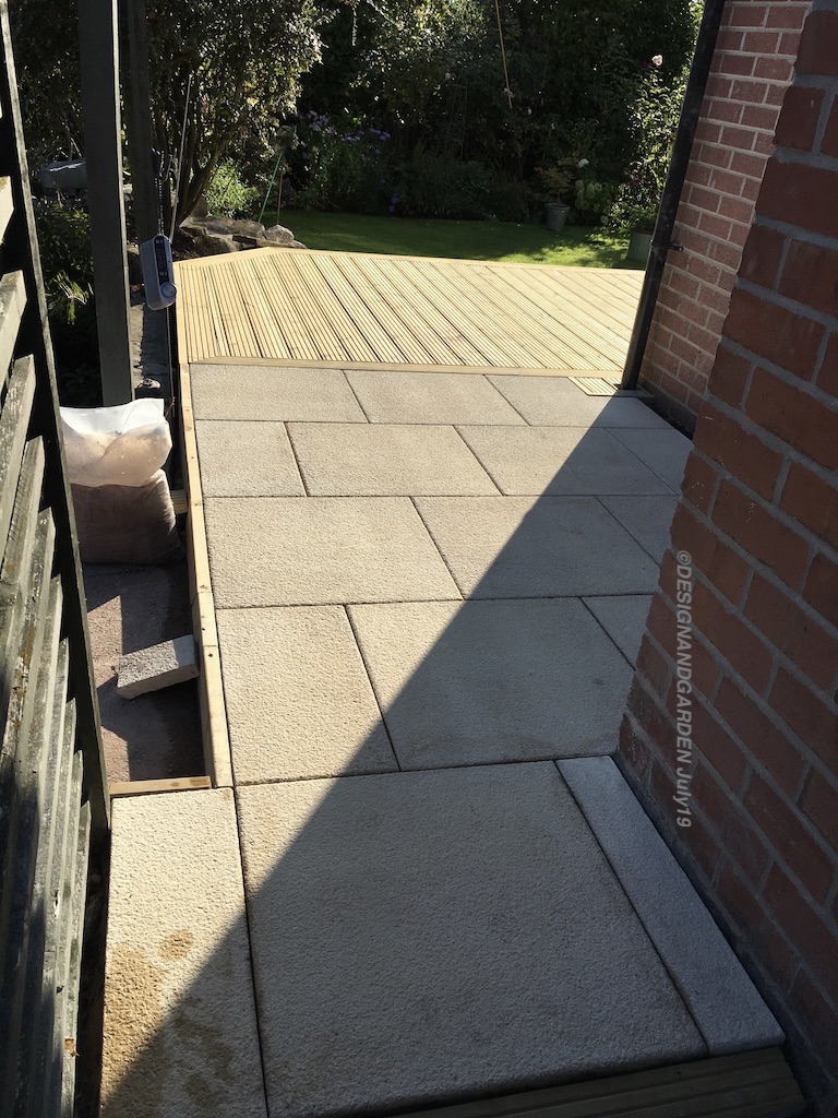 So with the finished decking now complete and the fish moved into their new home, works then started on making the step from the decking to the drive level. This was decided that slabbing was suitable, both for ease and tidiness but also for a design look that would later be added for the rest of the pathway at a later day.