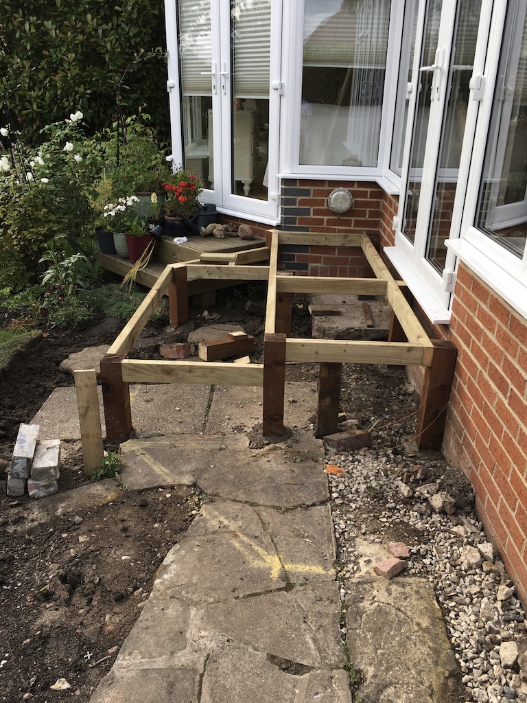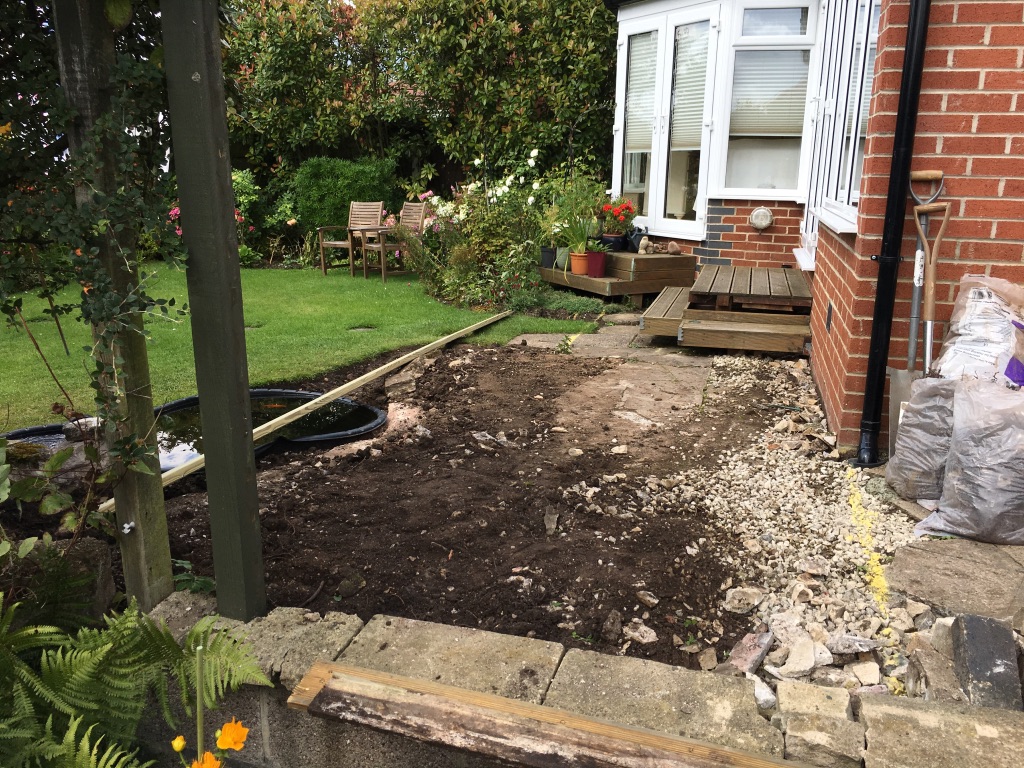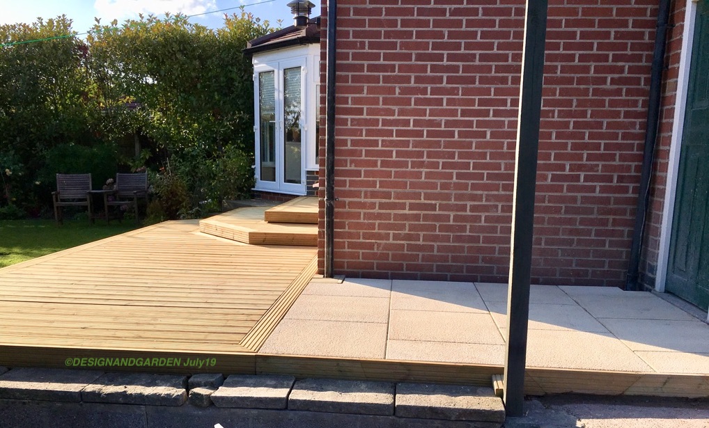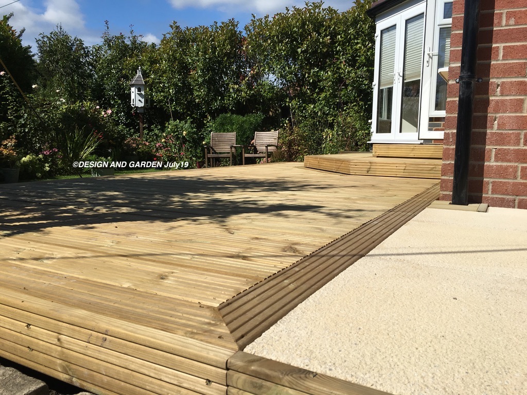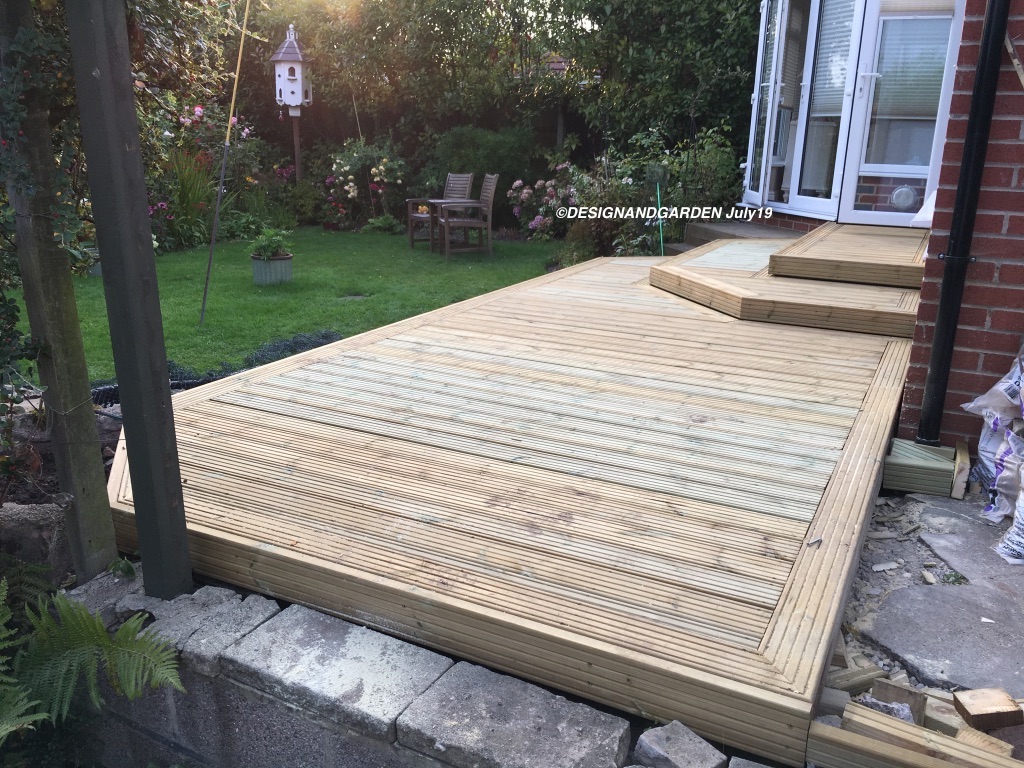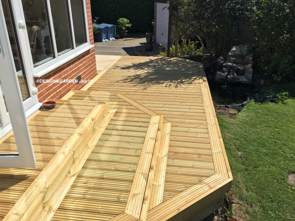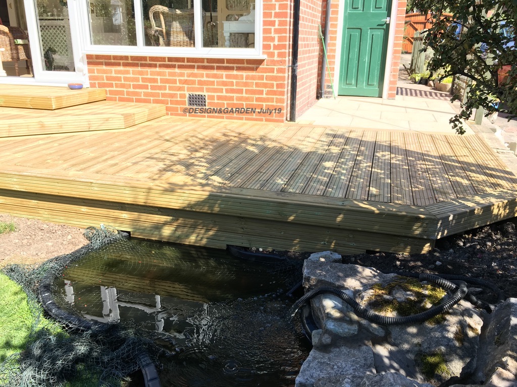 Removal of the old ‘dangerous’ decking and creating a safer level. Also moving the concrete fish pond slightly more into the garden. And finally creating a level area from the drive area to the new decking.