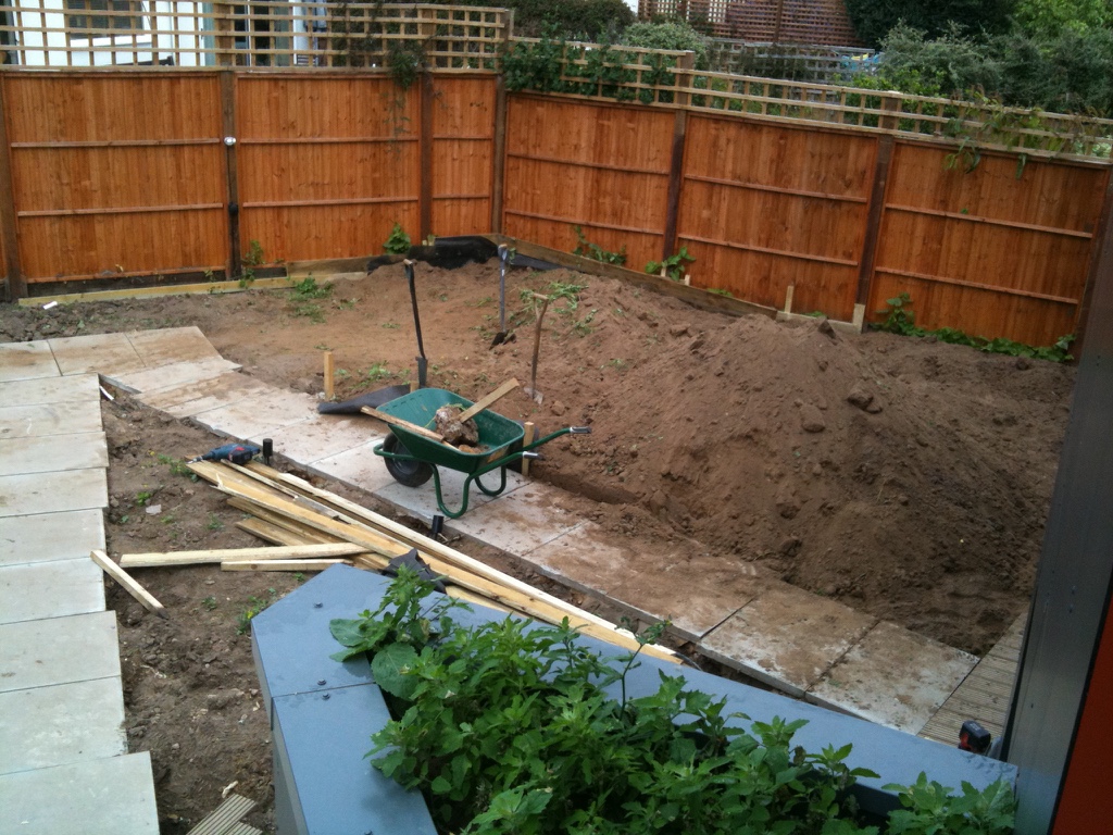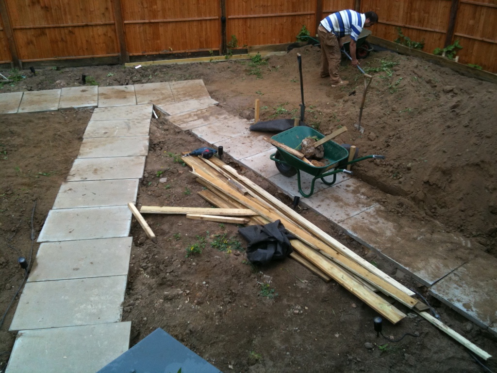 Firstly a mass of ‘boxing’ that was holding about 80 ton of soil had to be moved. This included concreted posts a mass of wooden edges. Also being careful of the lighting that had been fitted. All a bit frustrating really, as this was constructed to aid it being signed off by the building inspector. It had been down for less than a month and now we were asked to remove it.