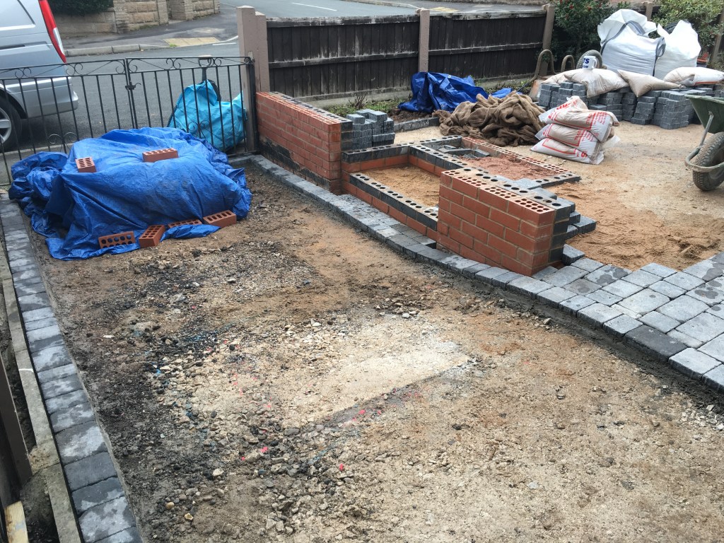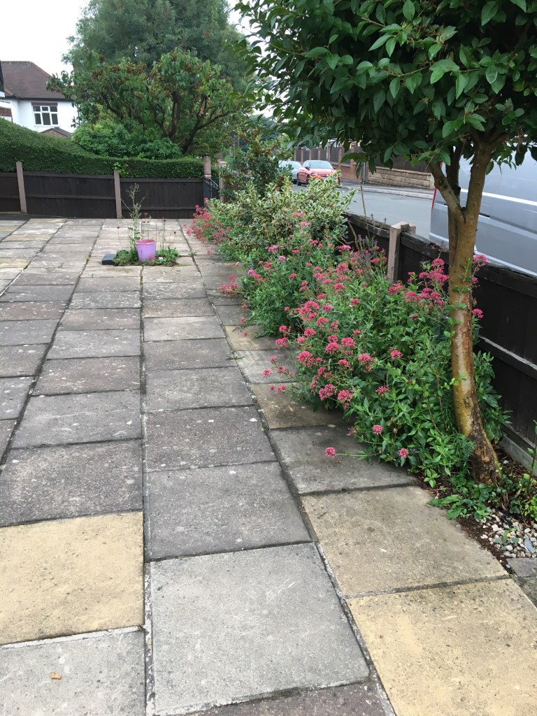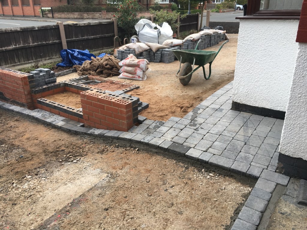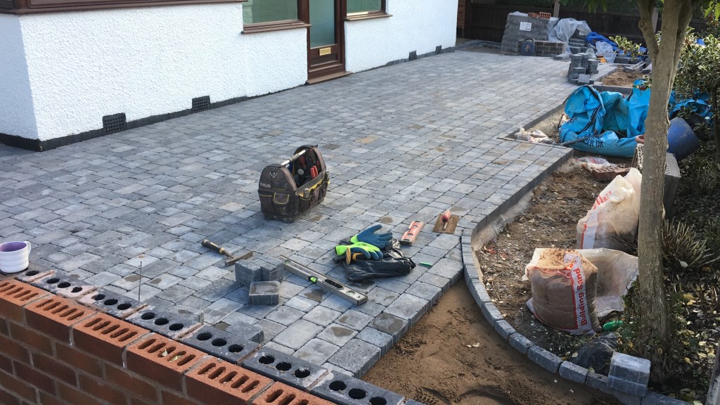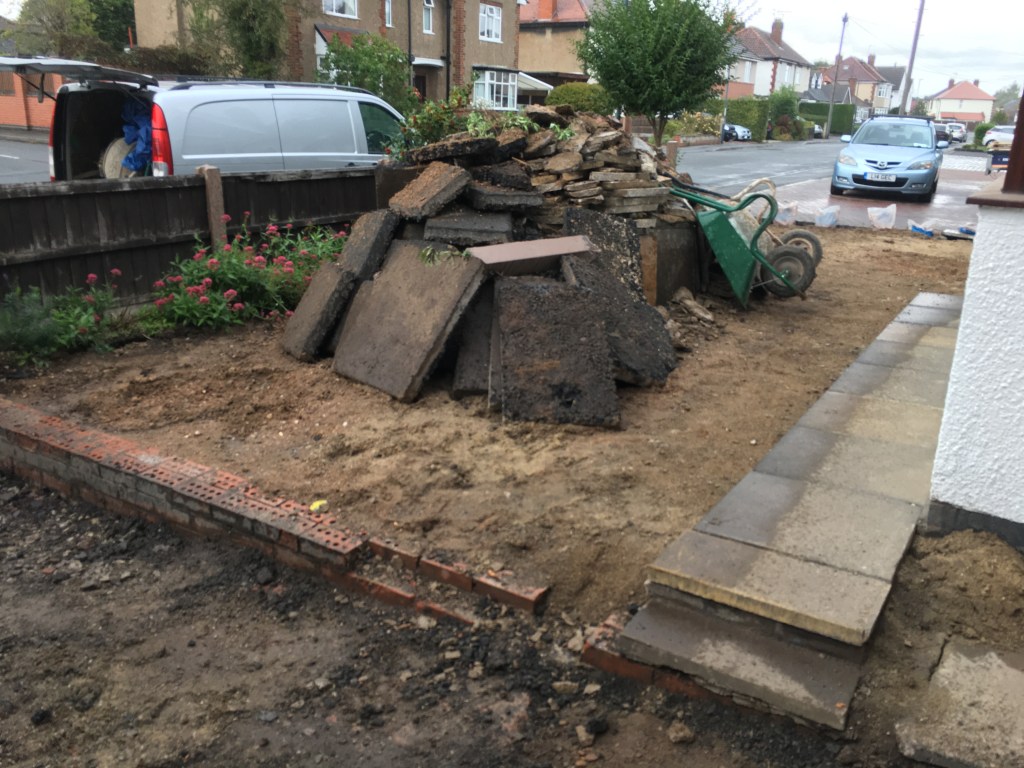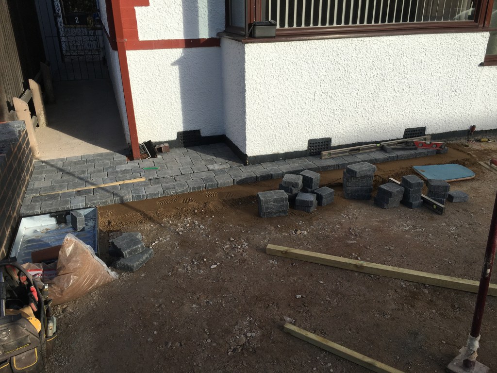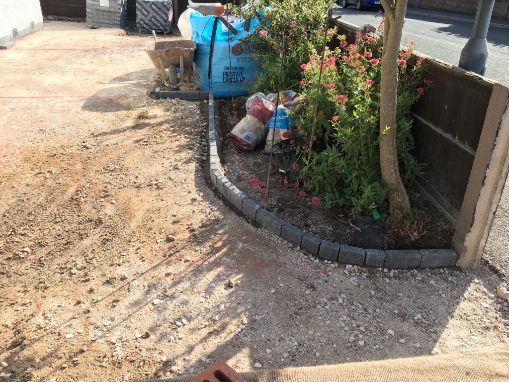 The new porous block paves will give way to ugly outdated slabs. Giving a better flow of water away from the house and using it to feed the new planting.