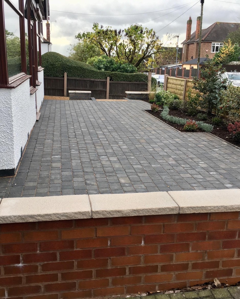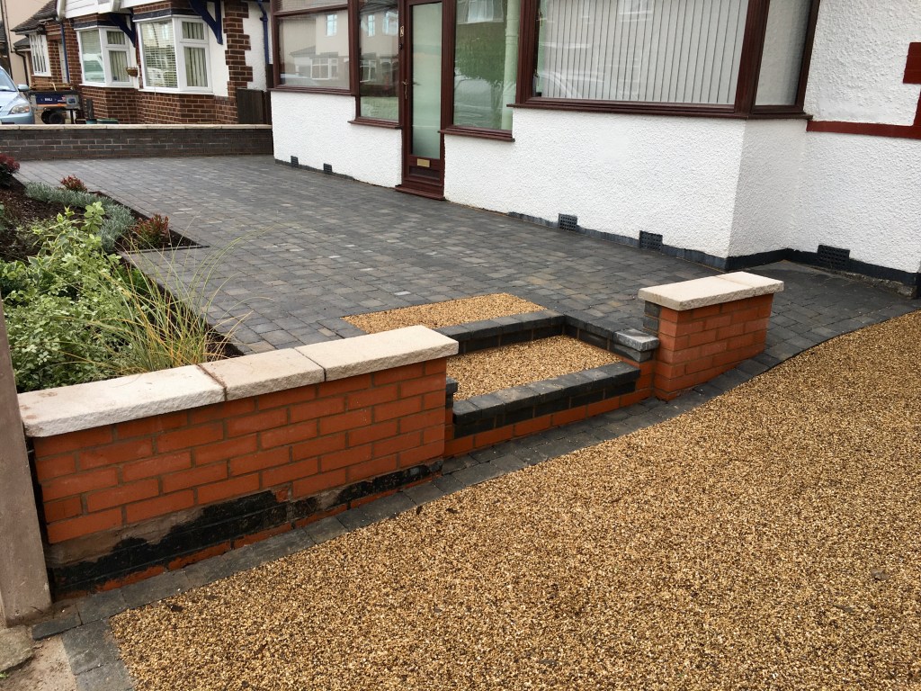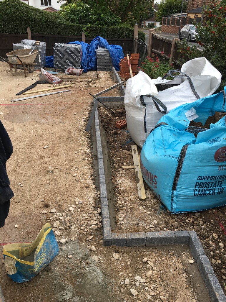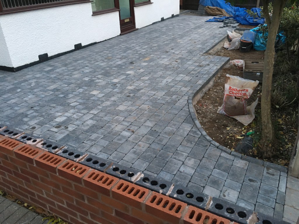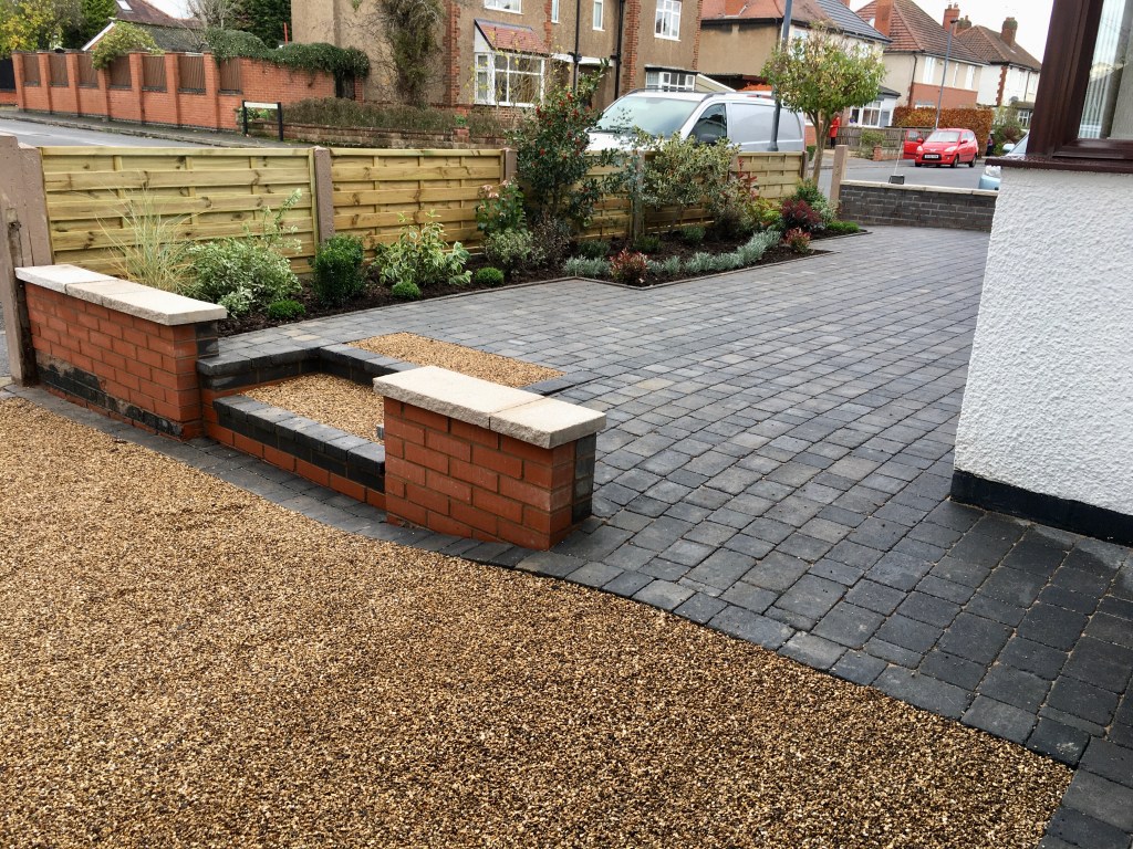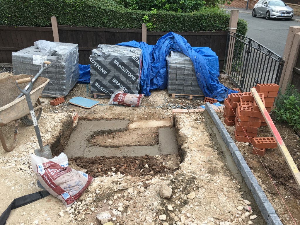 The new porous block paves will give way to ugly outdated slabs. Giving a better flow of water away from the house and using it to feed the new planting.