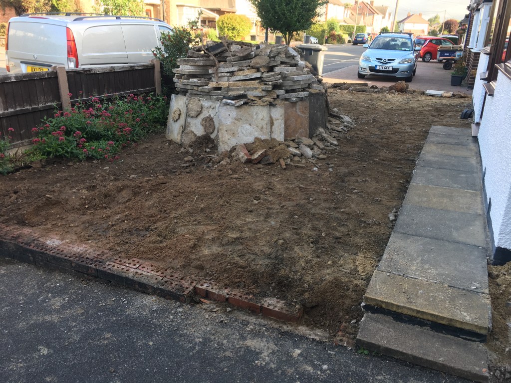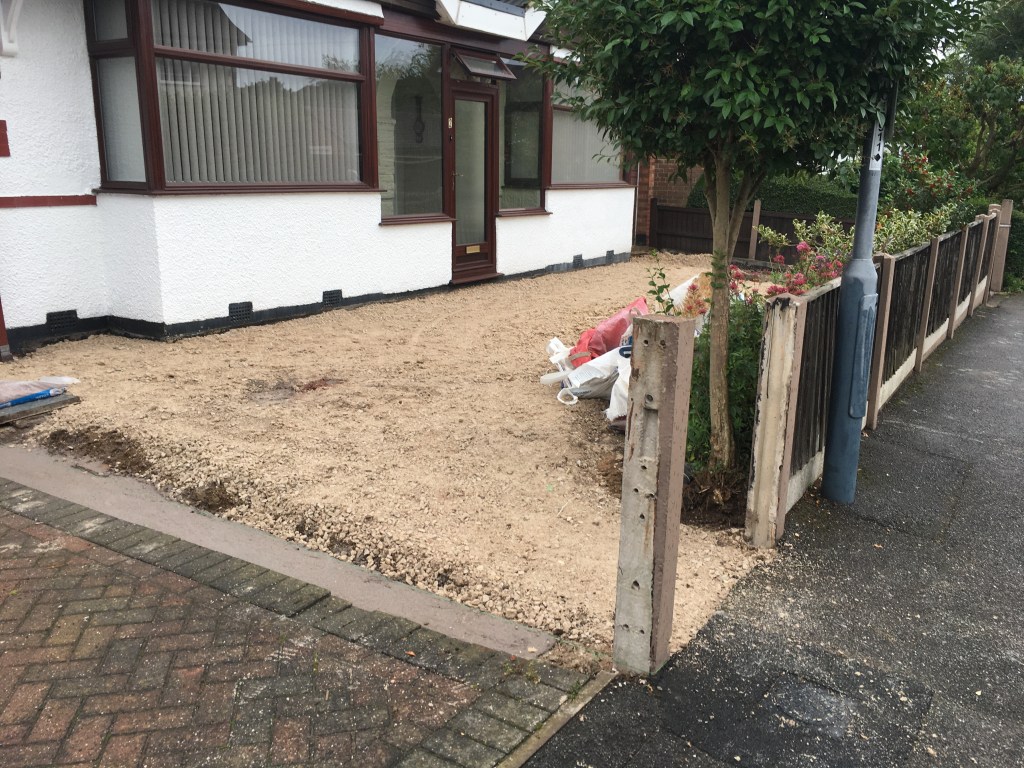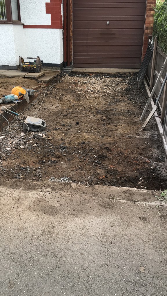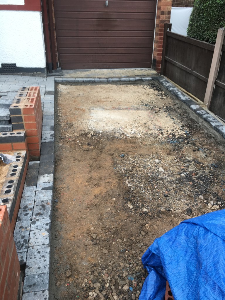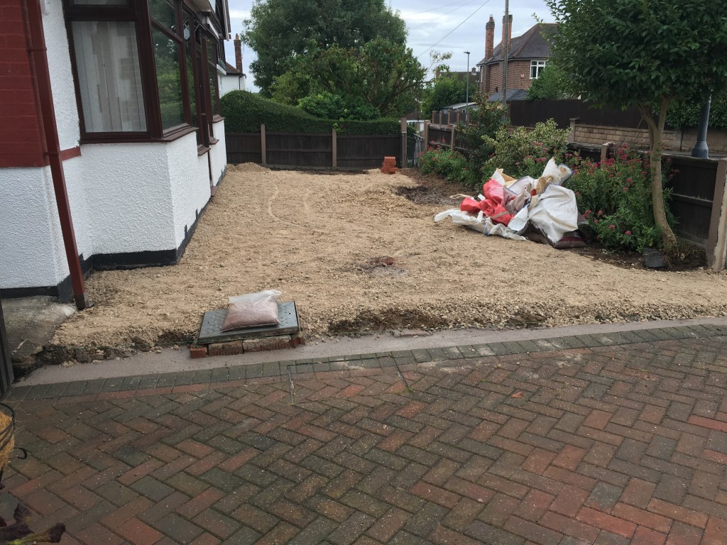 So let’s get stuck in. All the old is removed and a ground check is undertaken. Checking for pipes, wires, or concrete. In this case, it was concrete. Quite a lot of old concrete in odd areas. So it’s then all leveled as required and 5 tons of MOT type1 Stone is applied as a ground base.