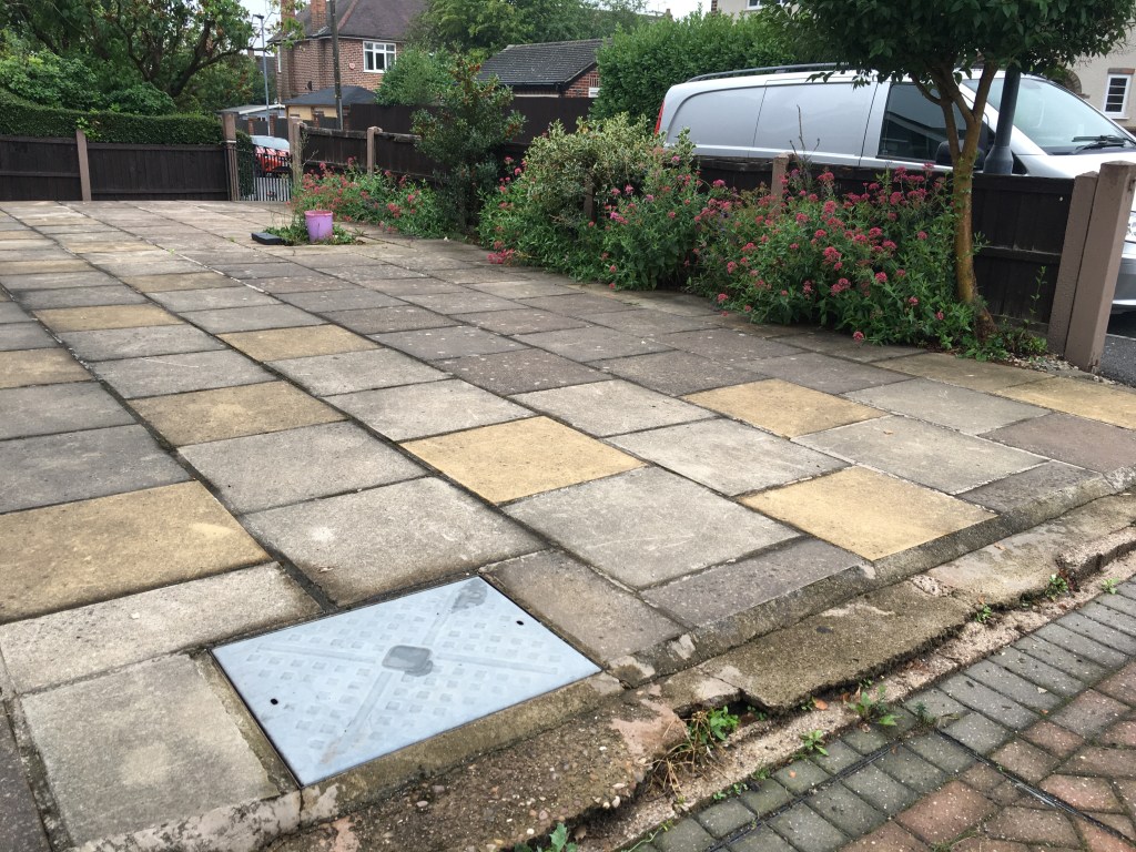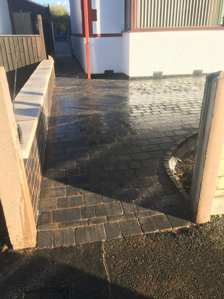 Careful consideration was chosen for the water flow over the blocks. The water was to be spread evenly over the block area so it never creates a slippy section. So the water was moved to the new improved drain a the top left, with the largest amount of water going into the planted area and the rest towards the wall to run along that edge and out to the kerbside. The same was achieved with the lower steps onto the drive.