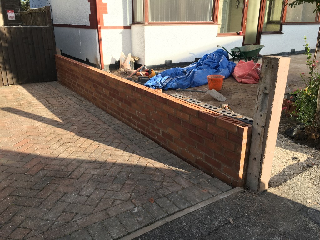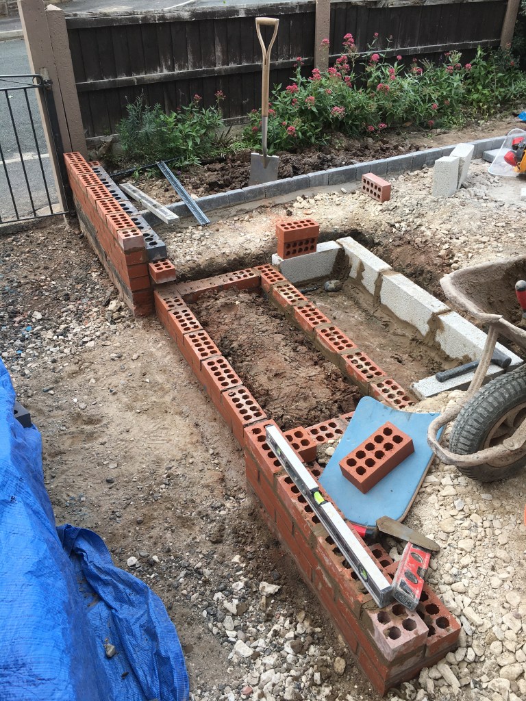 It was decided that the original wall was left due to ground issues and the fence posts. So a new wall and step area were built to blend in with it but in a two-tone red/grey black finish.