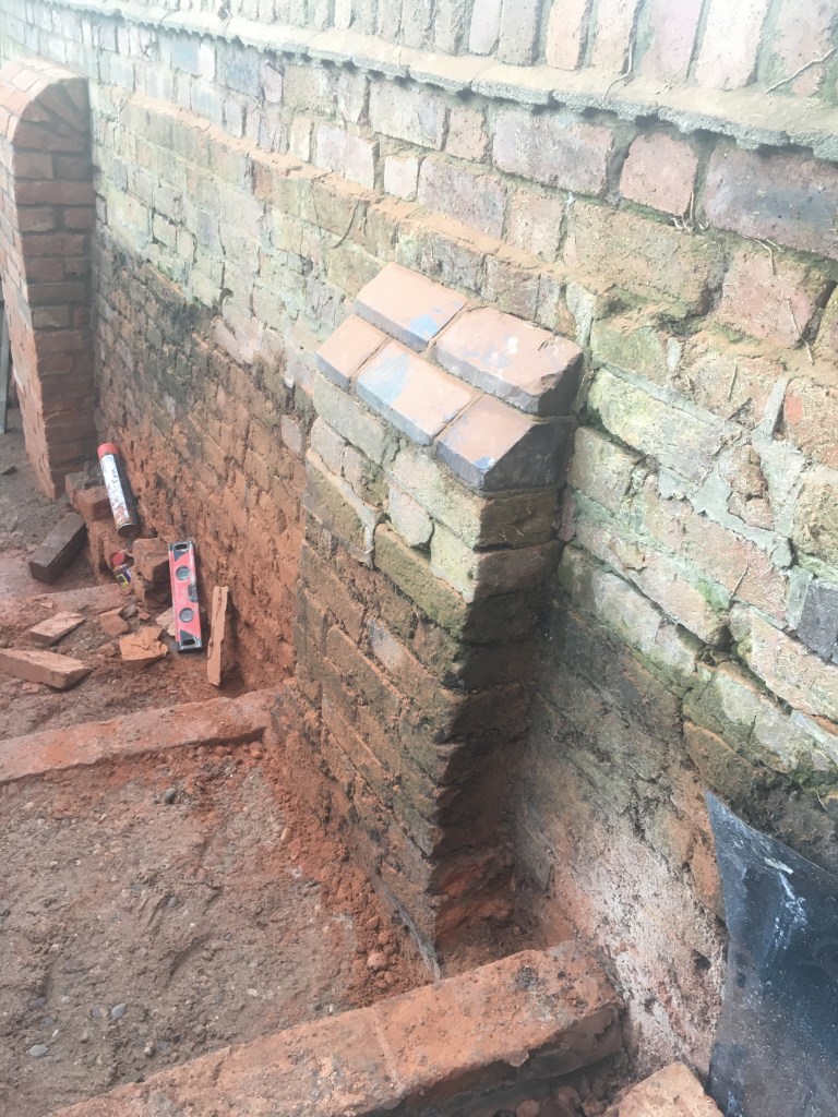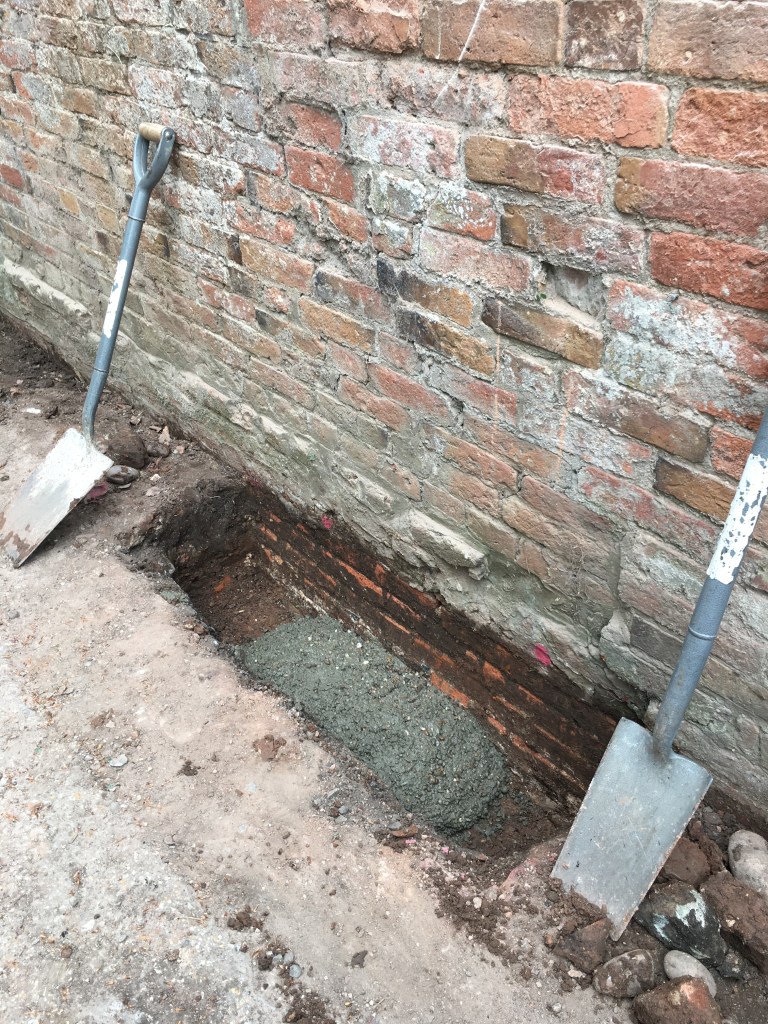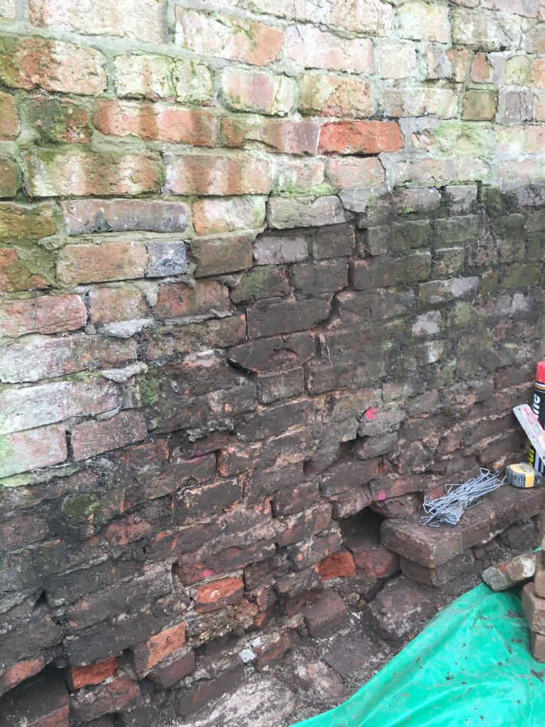 The old wall buttresses are taken down, and all the soil and dirt are removed from the wall and inside the wall cavity. Concrete and new ‘reclaimed’ bricks are used to repair the wall.