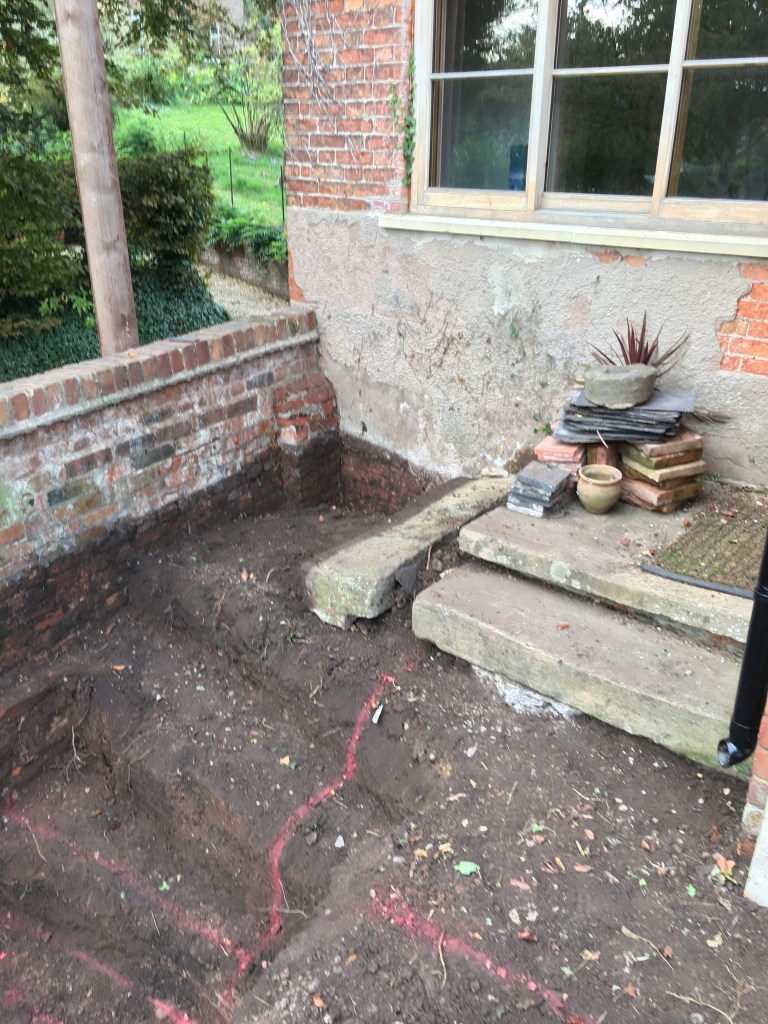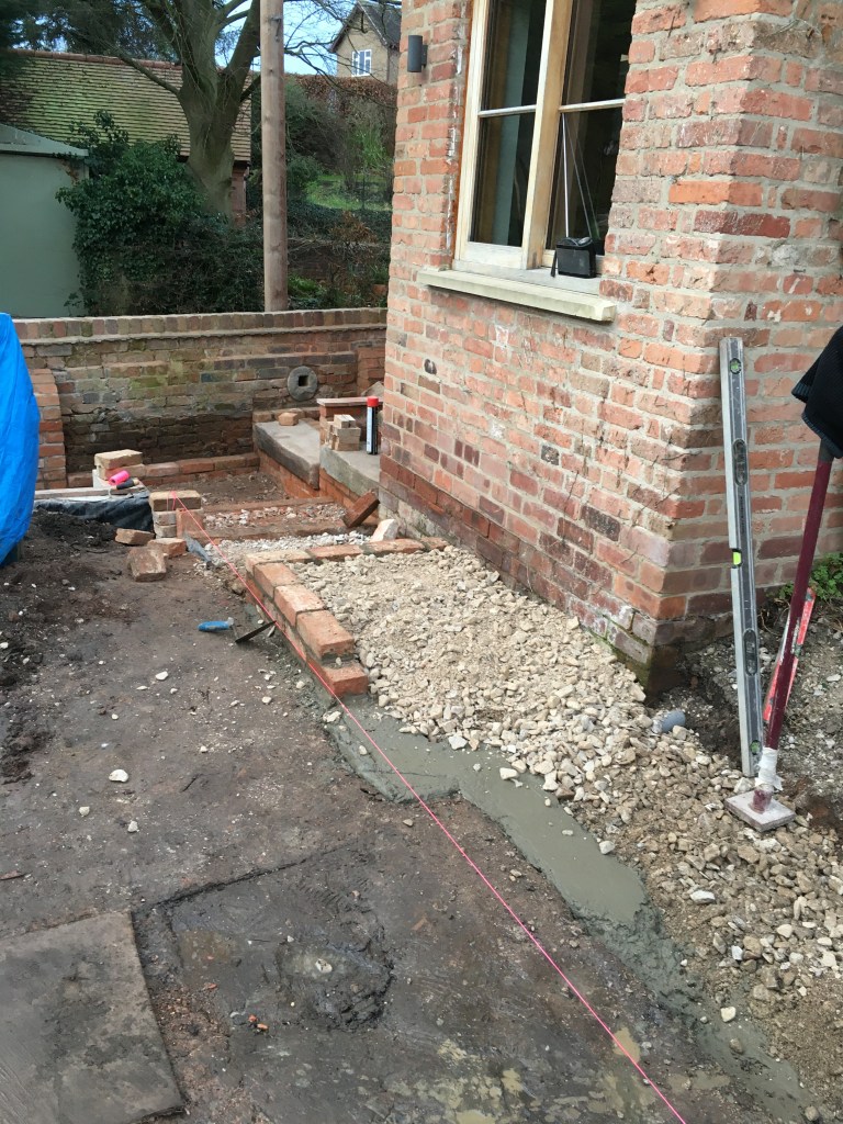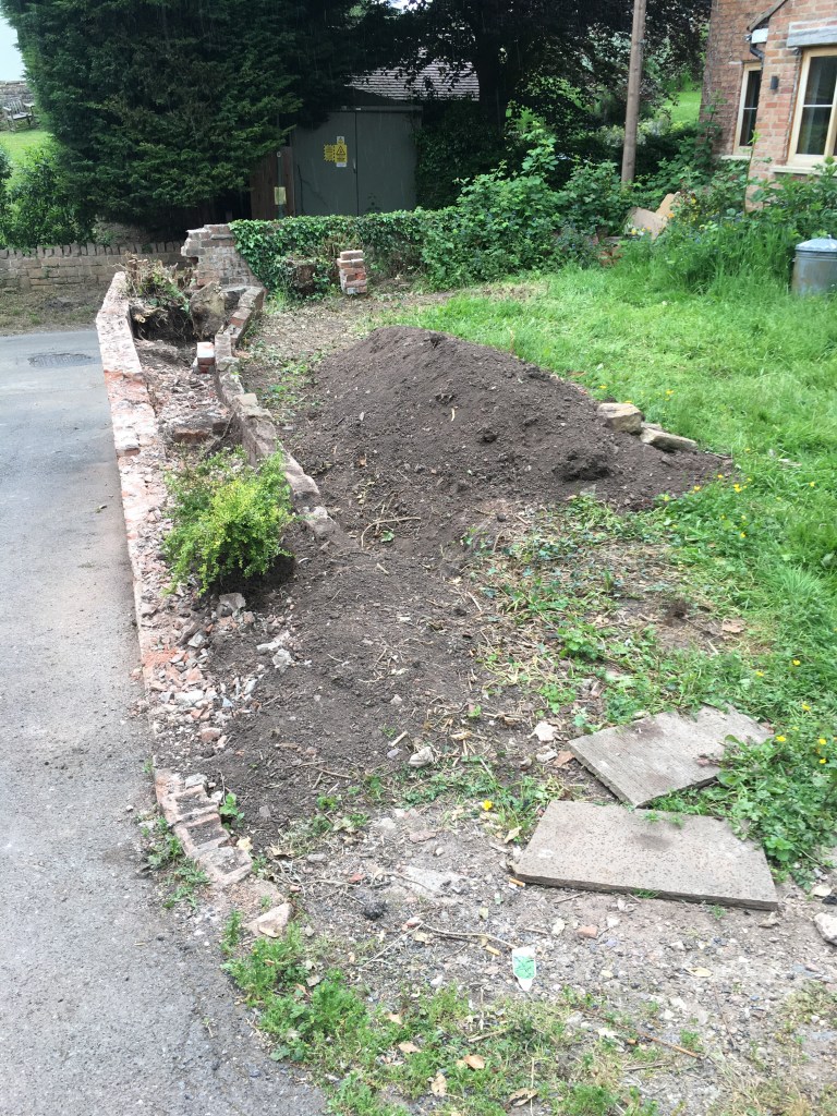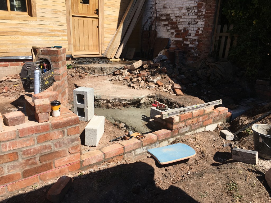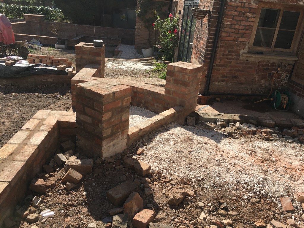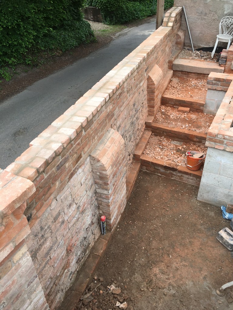 Large quantities of waste and unfortunately the original soil had to be removed, sadly there was no room to save it and it was of lovely quality. The upper path and steps were arranged and then the footings were sorted and yet more brickwork was added.