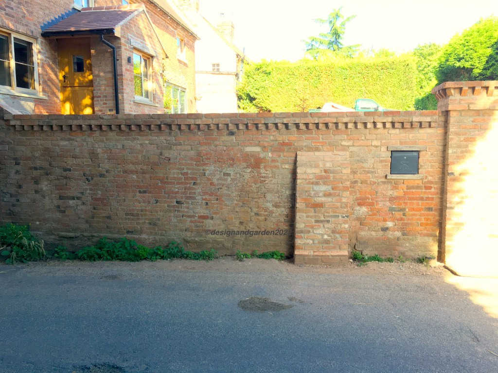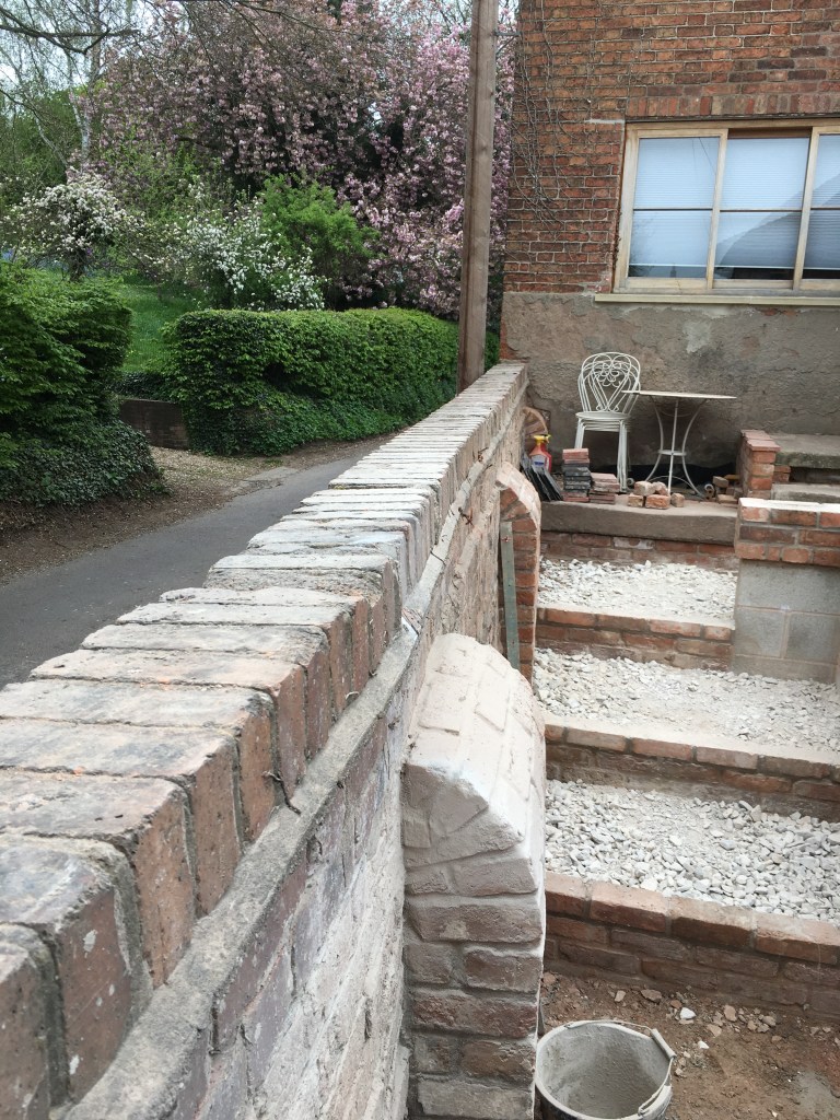 The outer wall is now complete and secure. The decorative ‘chimney’ section is done, together with a raised upper area towards the house and dogtooth edging to match the house. An extra six courses were added in bricks to get the correct level, including having to slice bricks in half to get the level.