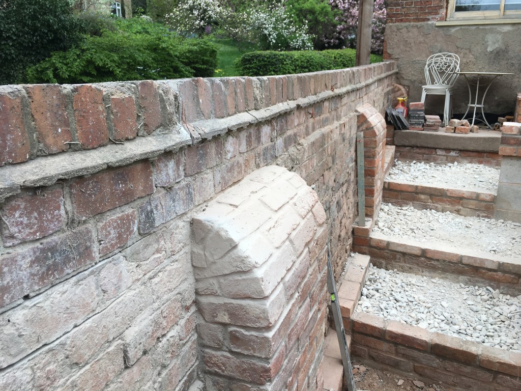 So the buttresses on the wall are getting replaced. Old bricks get replaced where needed. The level is being sorted and steps are now added to the ground.