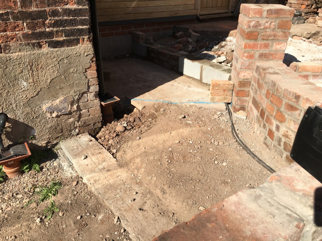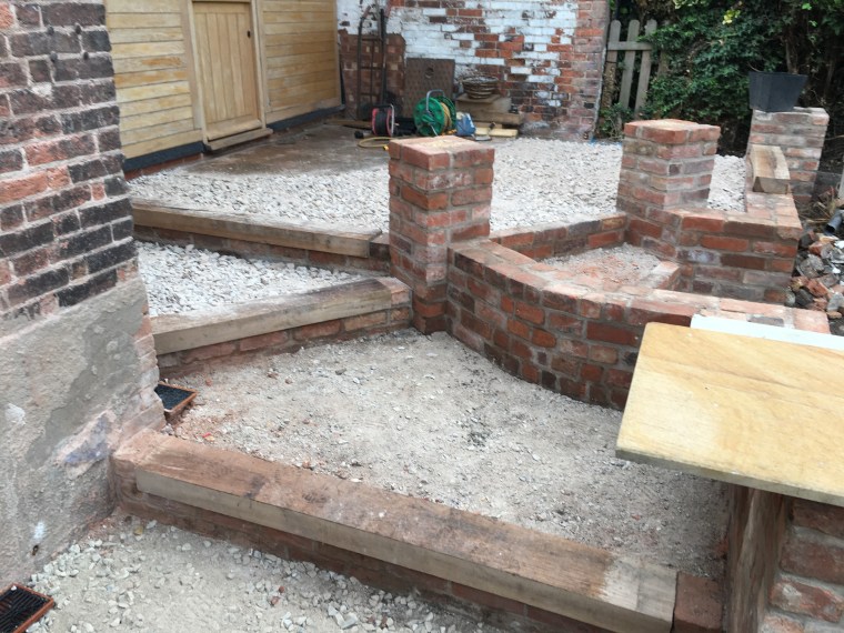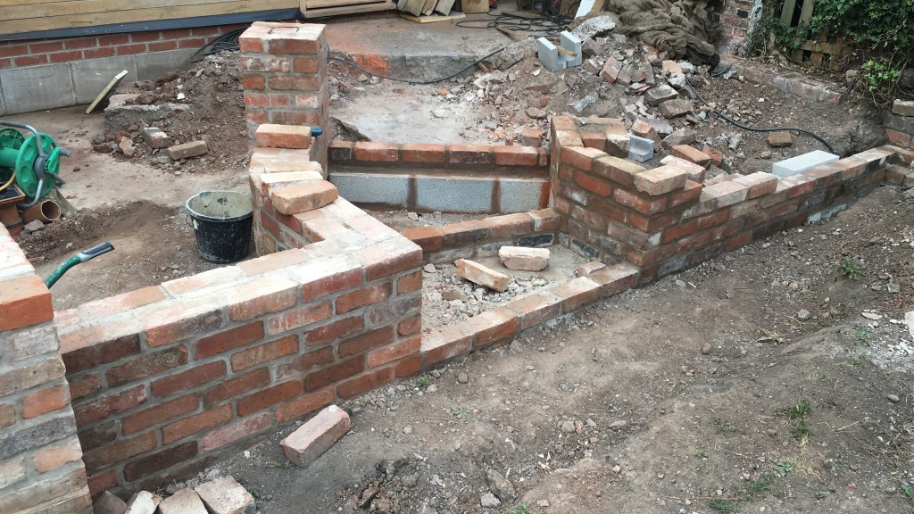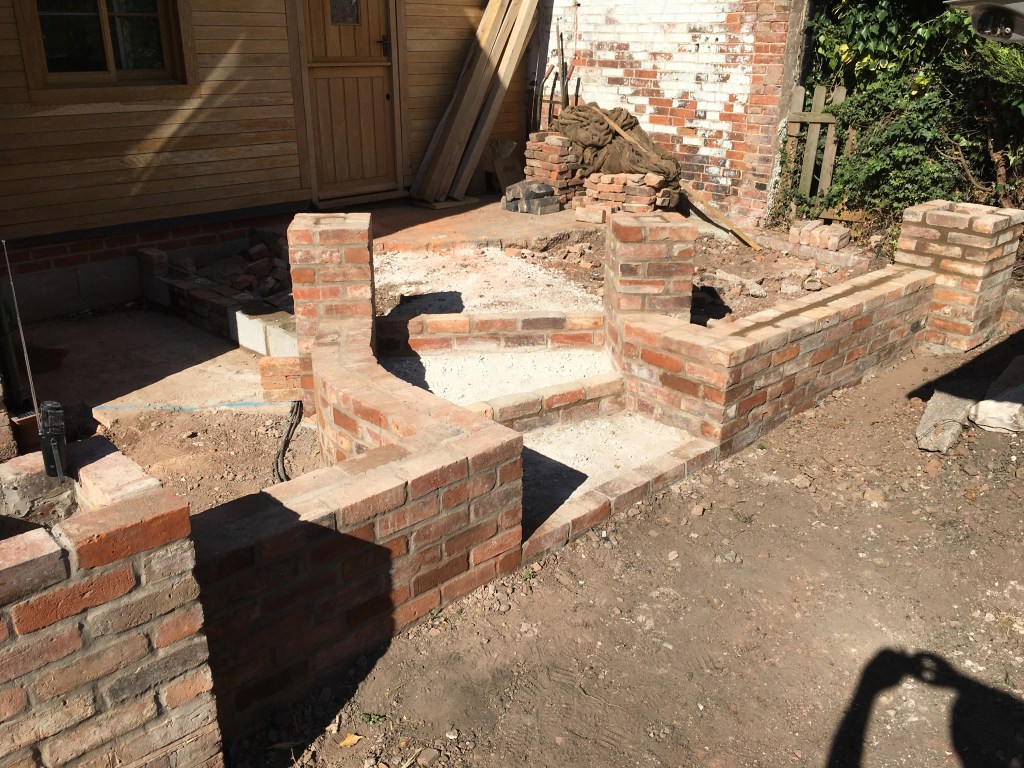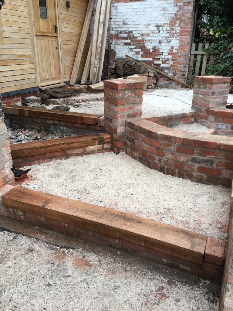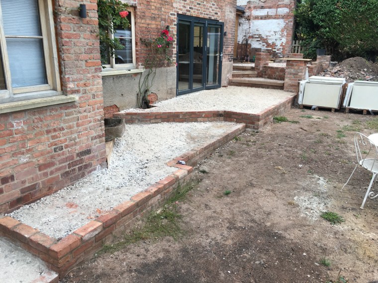 The upper patio was built and the level needed to be the same as the floor inside the kitchen, behind the bi-fold doors. A series of steps, using the old reclaimed bricks were created.