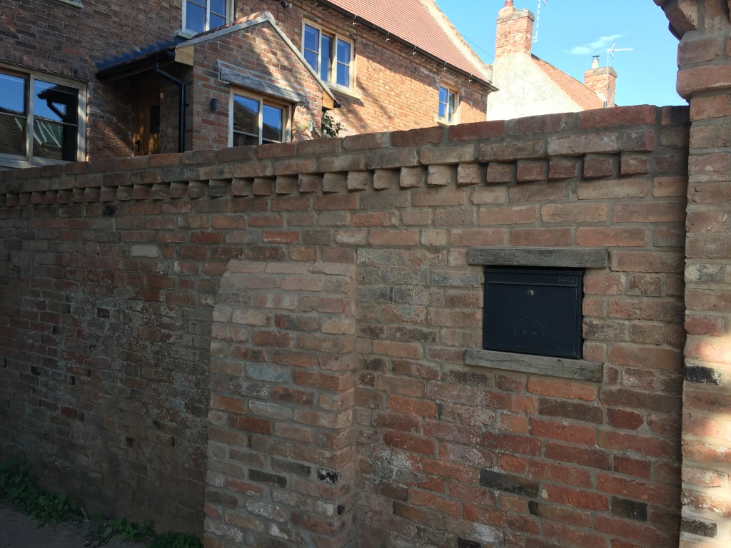 The outer wall on the drive-side had a few more courses added. Also, the dogtooth brickwork was added to match the design of the roofline on the house. The ‘chimney’ section was copied from the house next door which had that design.
