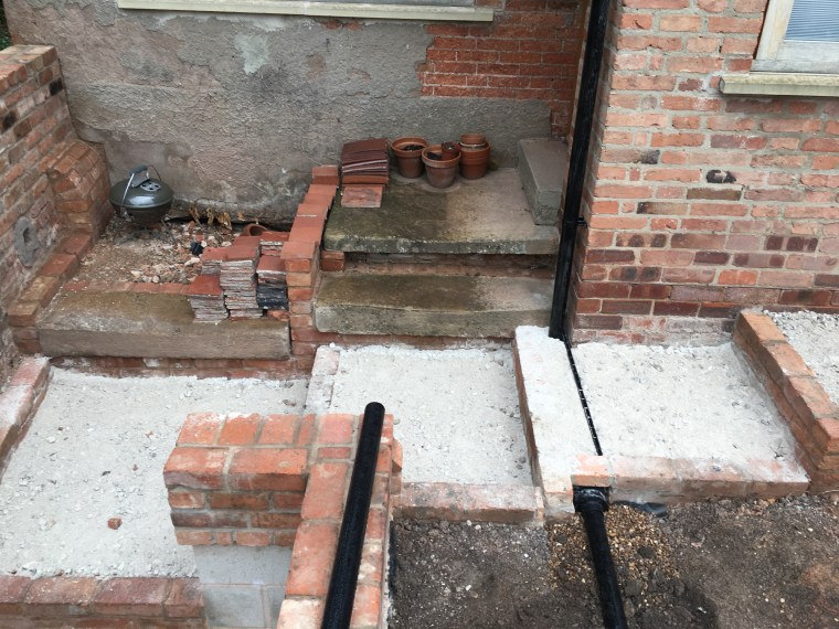 The steps from the lower area are finished and a slot drain has been added to a soakaway from the porch roof.