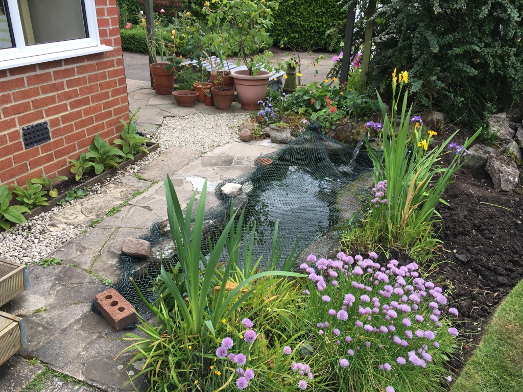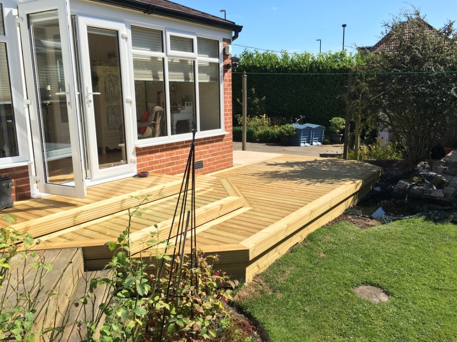 Removal of the old ‘dangerous’ decking and creating a safer level. Also moving the concrete fish pond slightly more into the garden. And finally creating a level area from the drive area to the new decking.