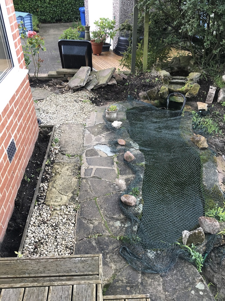 The original decking… the client had recently fell off the steps which gave reason to have it changed. The old pond with the clients treasured fish has seen better days…The new pond moved slightly more into the garden…