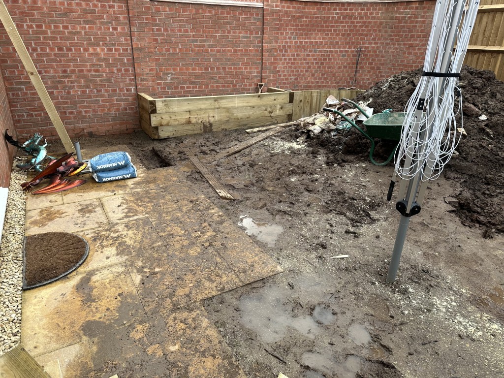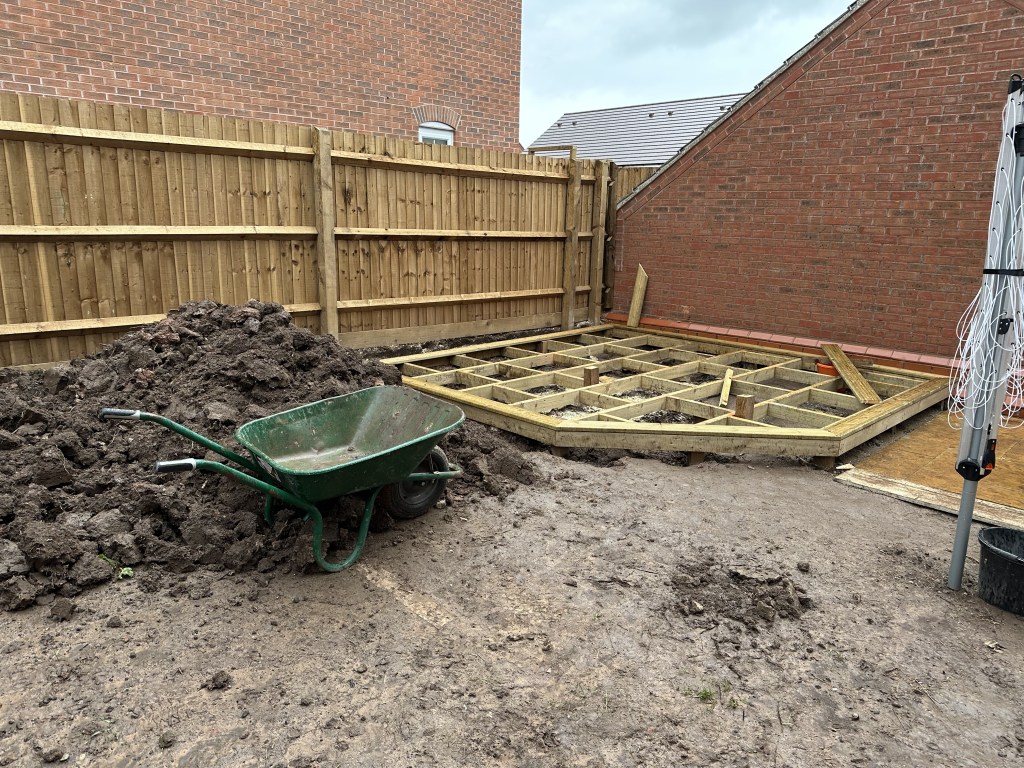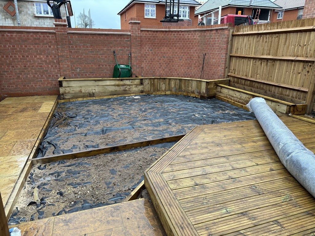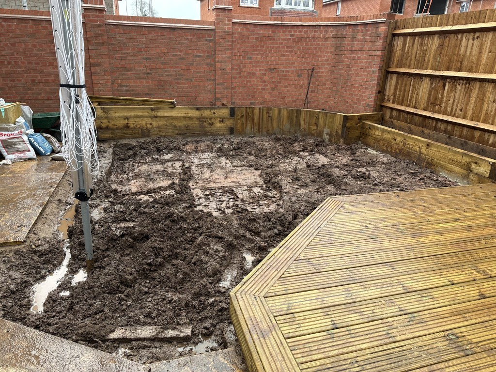 The decking was lifted to the level of the ‘new’ lawn, however the lawn hadn’t been laid yet.