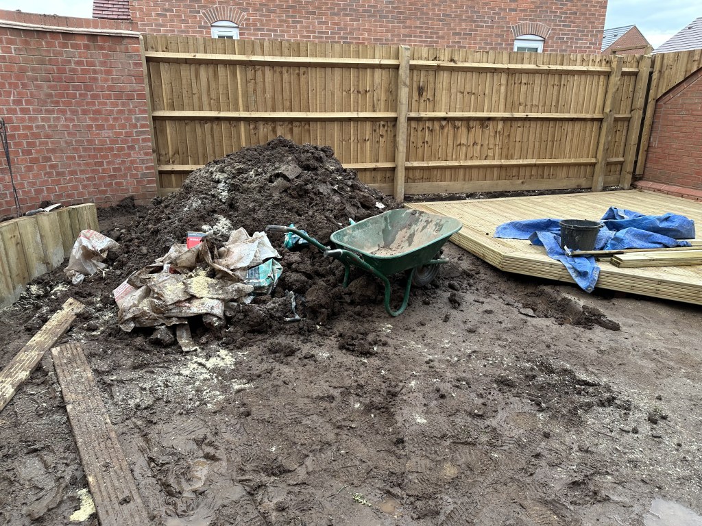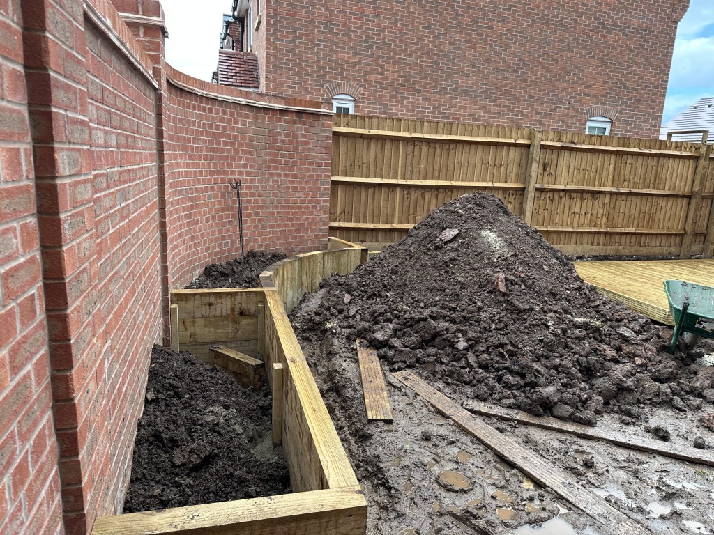 Now is the messy section of the job. A few tons of soil had to be moved to level the area out for the decking. And then digging out the area ready for the sleepers, ready for future planting.