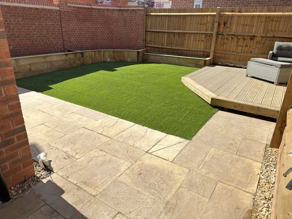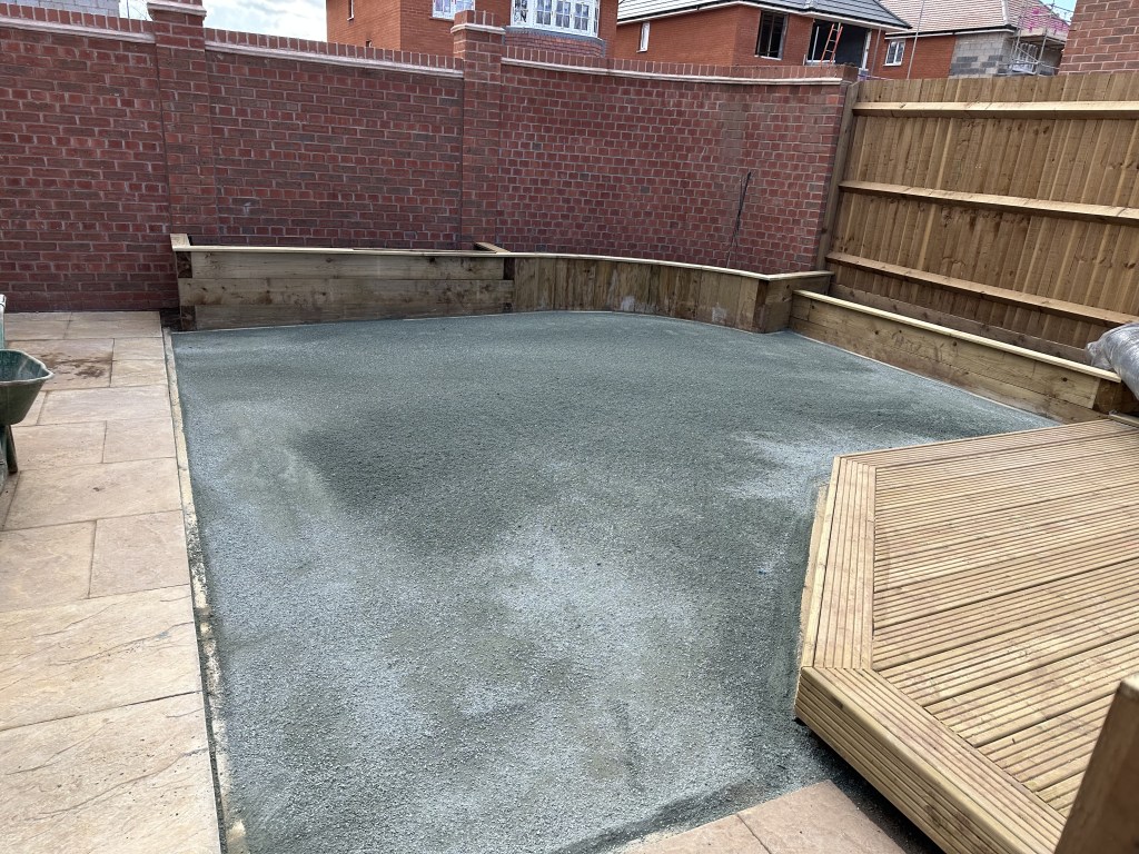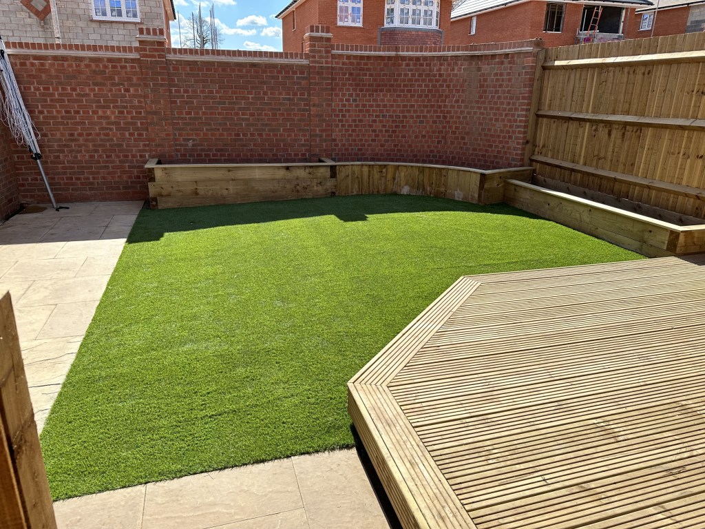 And here go… The final look. Extended Slabbing. Full floating decking area. Planting areas with sleepers and new ‘lawn’.